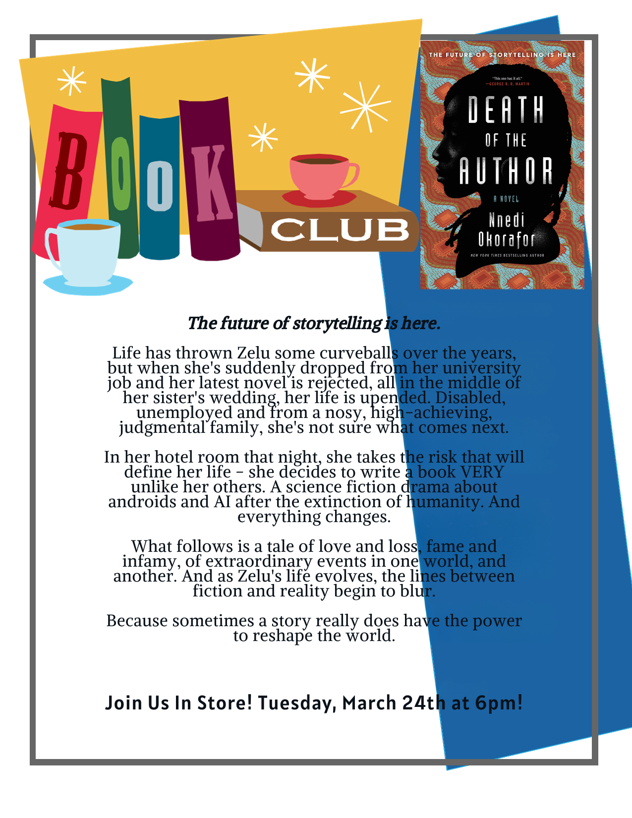 🔹Our book club pick for the month of March will be Death of the Author by Nnedi Okorafor, @nnediokorafor, and we can’t wait to see you guys for discussion!
